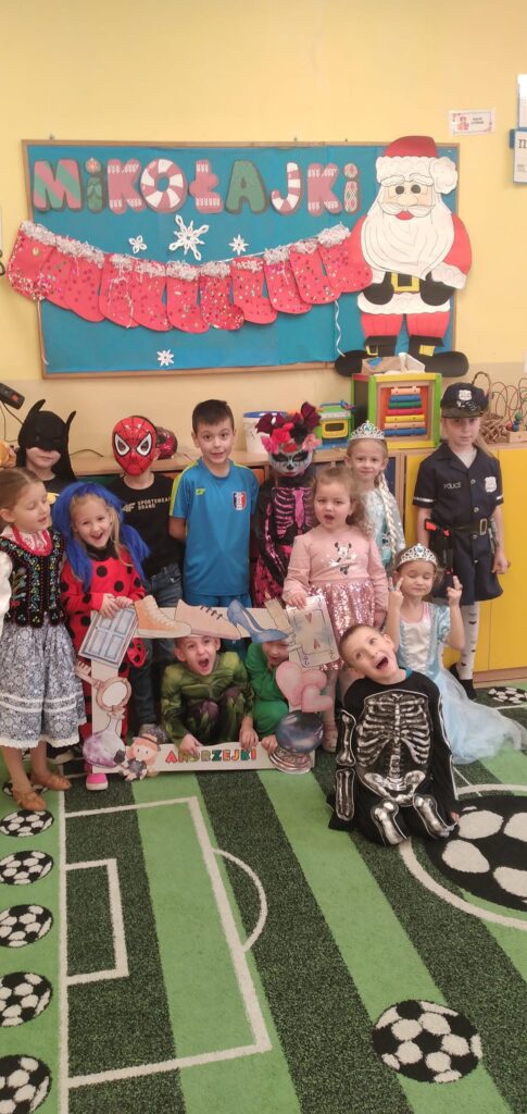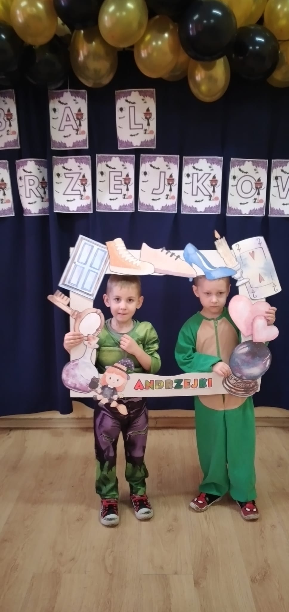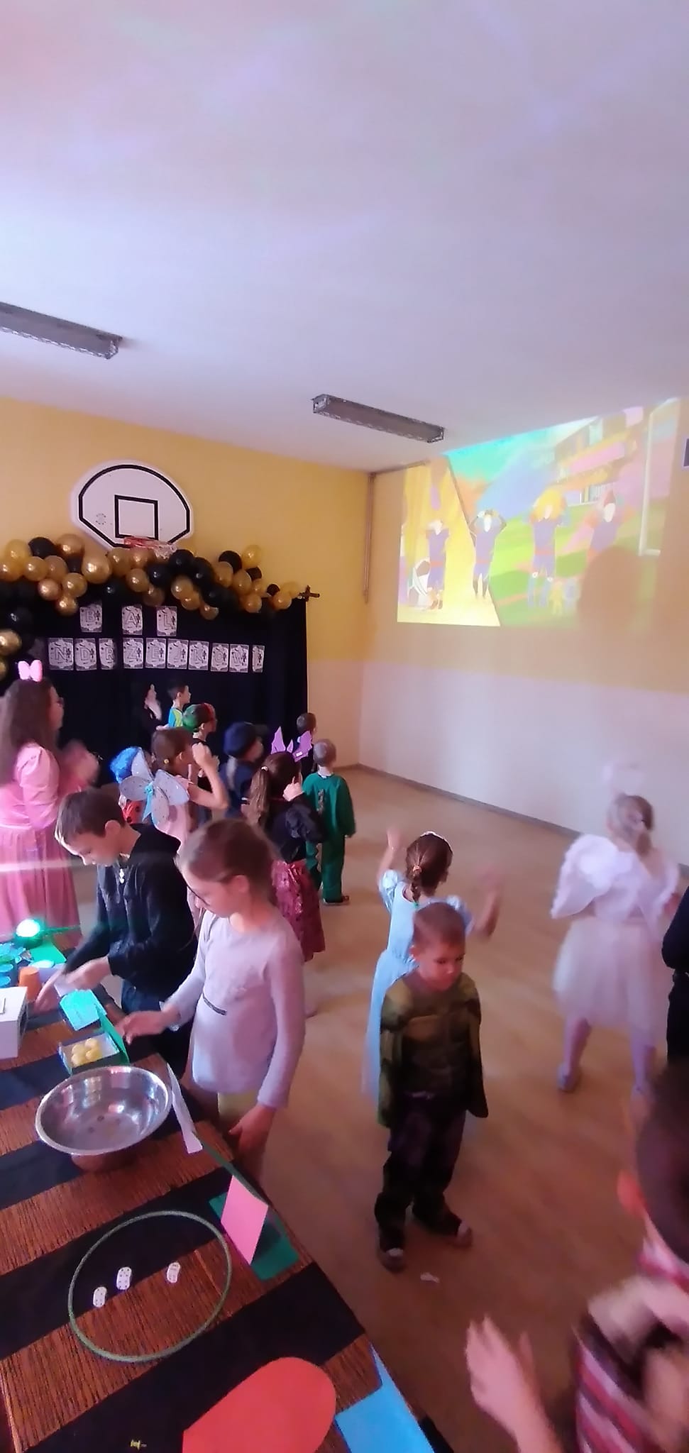 Zabawa andrzejkowa osiągnęła swoje apogeum na sali gimnastycznej. Dzieci, w swoich kolorowych przebraniach, tańczyły do ulubionych piosenek, bawiąc się w rytm muzyki.