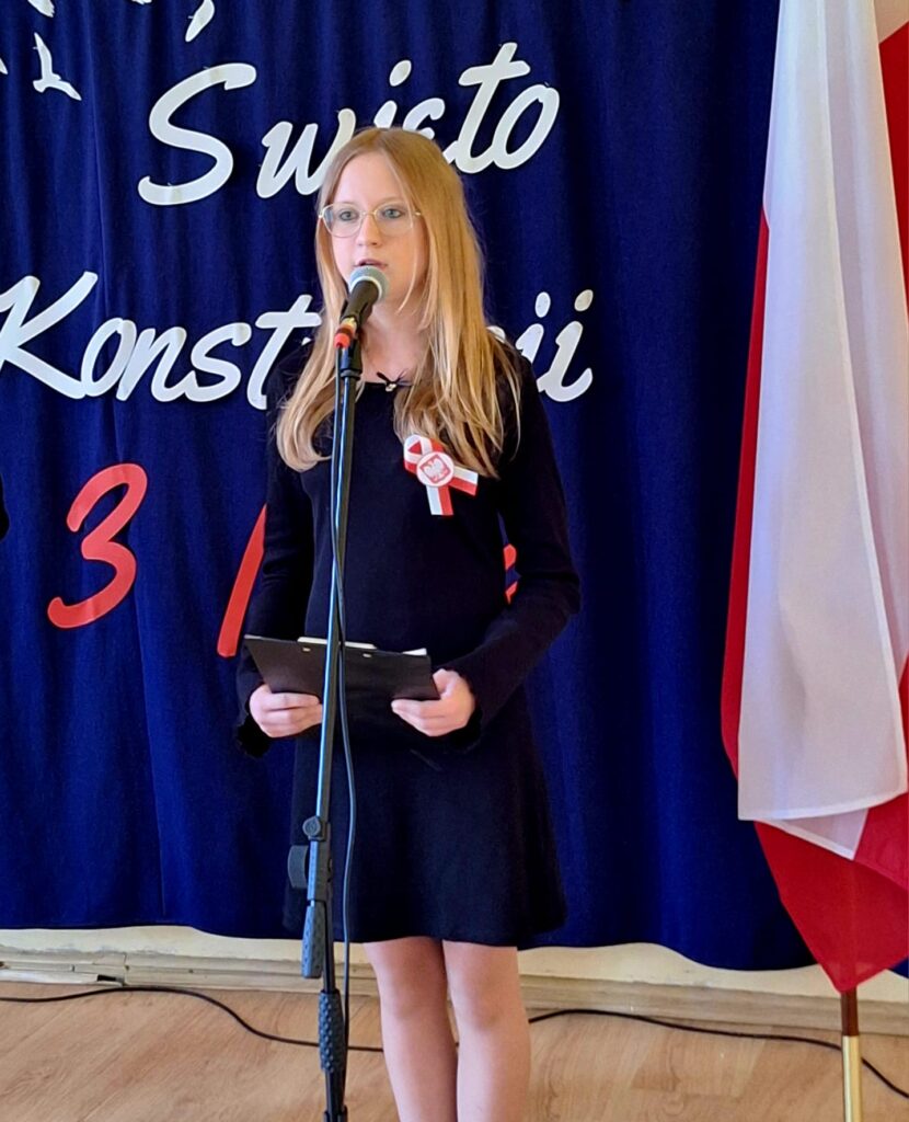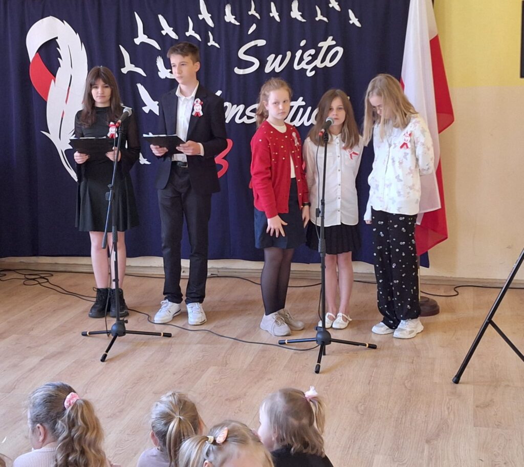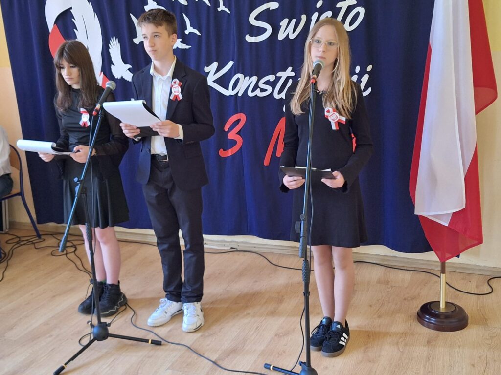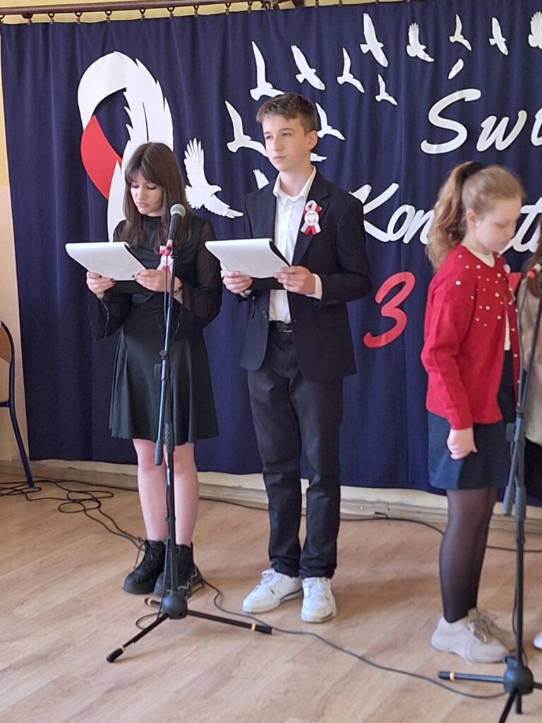Akademię rozpoczęto od wspólnego odśpiewania hymnu Polski, a następnie wybrzmiał hymn naszej szkoły. W programie znalazły się również występy uczniów, którzy poprzez wiersze, pieśni i krótkie inscenizacje przypomnieli historię uchwalenia Konstytucji 3 Maja oraz znaczenie tego aktu dla naszej ojczyzny.
